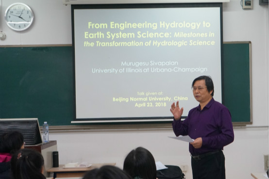2018年4月23日下午,应我院徐宗学教授邀请,美国伊利诺伊大学(UIUC)Murugesu Sivapalan教授做客“水科学大讲堂”。我院徐宗学教授、王会肖教授、王国强教授、刘海军副教授、彭定志副教授,地学部段青云教授、叶爱中副教授、陈波博士等我校师生近40人参加了本次学术报告会。